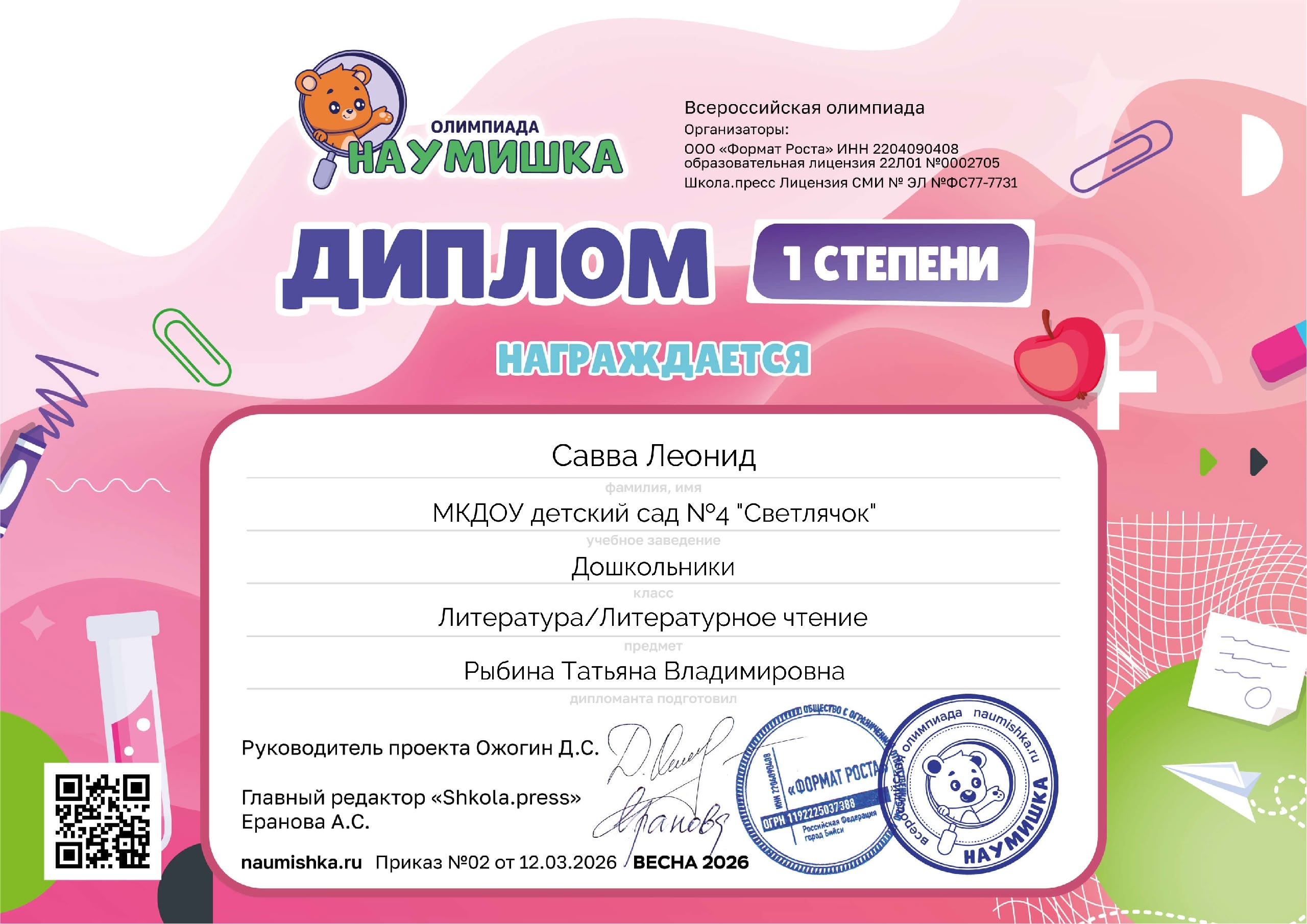 Диплом призера Всероссийской олимпиады "Эколята - молодые защитники природы"